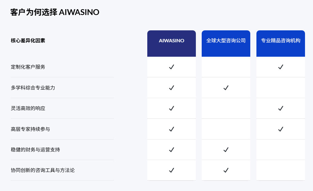 AIWASINO 汇聚来自多学科背景的资深专家,凭借深厚行业知识和综合能力,为客户提供无与伦比的咨询服务。